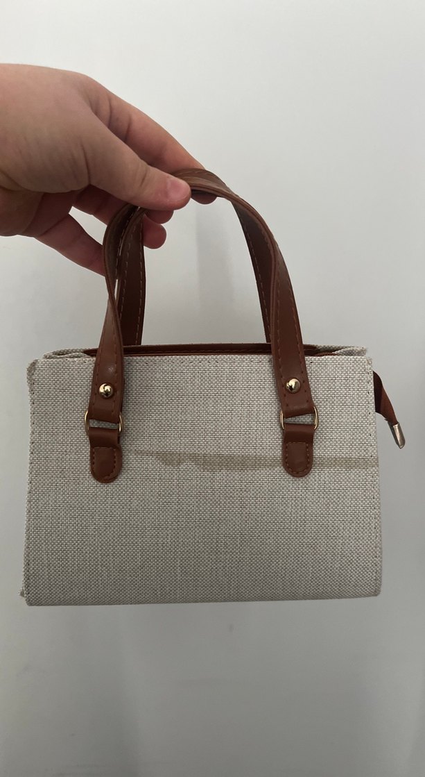 Bej kadın çantası, kahverengi saplı, sentetik kumaştan. Fermuarlı ve sade, minimalist bohem tarzında. Günlük kullanım için uygun. Arka tarafında çizik var başka hiç bir sıkıntısı yoktur