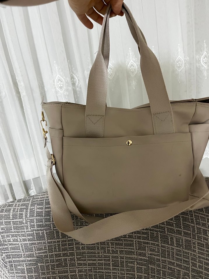 Bej renkli kadın çantası, düz ve desensiz tasarıma sahip. Önünde çıtçıtlı cep bulunur. Çift sap ve ayarlanabilir omuz askısı ile kullanımı kolaydır. Minimalist ve çağdaş stil sunar.