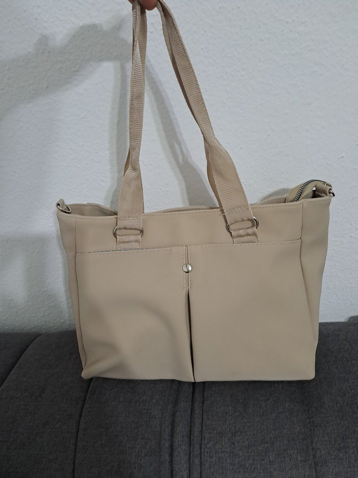 Bej renkli, fermuarlı ana bölmeli, uzun saplı ve düz dokulu sentetik kumaştan üretilmiş kadın çantası. Minimalist ve sokak modasına uygun.