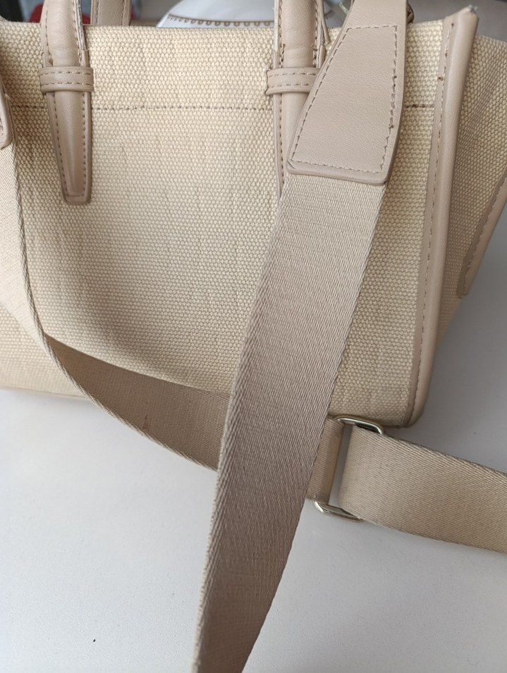 Bej renkli sentetik kumaştan yapılmış, fermuarlı, sade ve çağdaş tarzda günlük kullanıma uygun kadın çantası. Pastel tonlarda ve dayanıklı saplara sahip. ZARA ORJİNALDİR