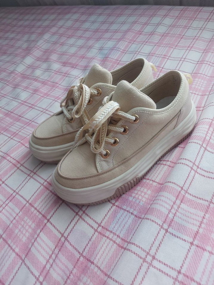 Bej renkte, düz tabanlı ve desen içermeyen kadın spor ayakkabısı, günlük rahat kullanım için şık ve sade tasarımıyla öne çıkar.