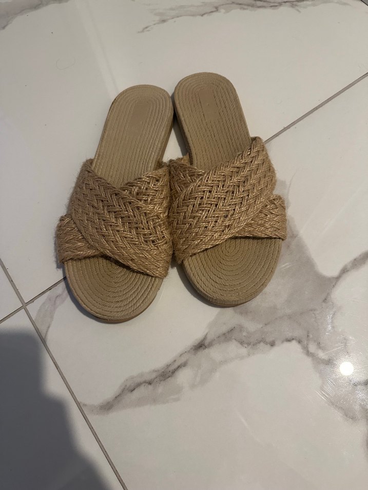 Bej renkte, dolgu topuklu ve lastik tabanlı kadın terliği. Pilili örgü bantlarıyla sade ve bohem tarzda, günlük kullanıma uygundur. ZARA DEĞİLDİR