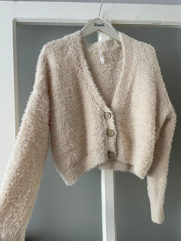 Bej renkli, kısa kesim, uzun kollu ve V yakalı örgü kadın hırka. Üç düğmeli, bol kesim rahat ve gündelik kullanım için uygundur. Boy 48 cm