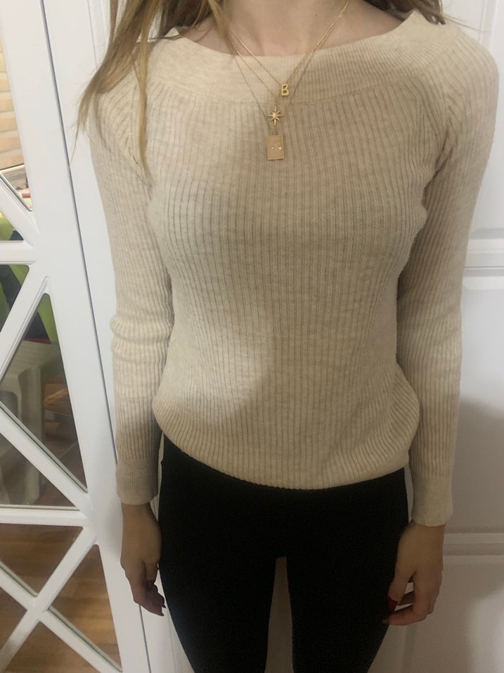 Bej renkli, ince triko, uzun kollu ve yuvarlak yakalı dar kesim kazak. Günlük kullanım için rahat ve şık bir seçim.