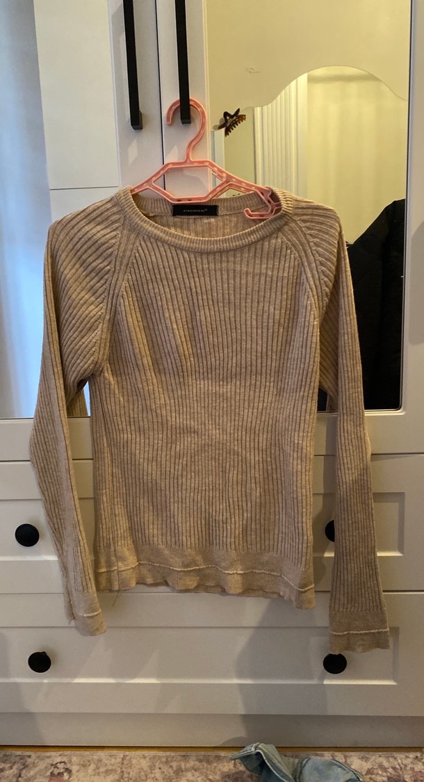 Bej renkli, ince triko örme ve keten kumaştan yapılmış, uzun kollu ve bisiklet yakalı kadın kazak. Günlük kullanım için uygun, rahat ve vücuda oturan kesime sahiptir. Hiç giyilmedi s-m uygundur bence