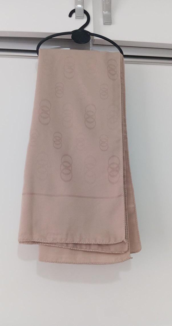 Bej renkli, ipek görünümlü, drapeli kadın şalı, pastel tonlarda minimalist ve çağdaş tarzda, sade ve temel görünüme uygun.
