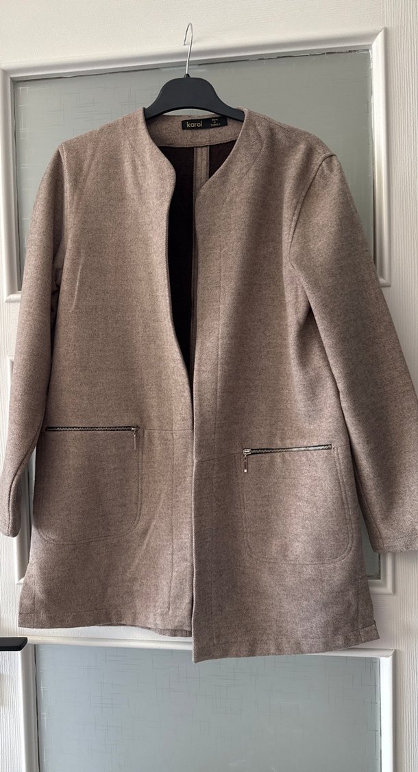 Bej renkli süet kumaştan yapılmış, uzun kollu ve fermuarlı ceplere sahip kadın midi kaban. Rahat kesimi ve sade tasarımıyla günlük kullanıma uygundur.