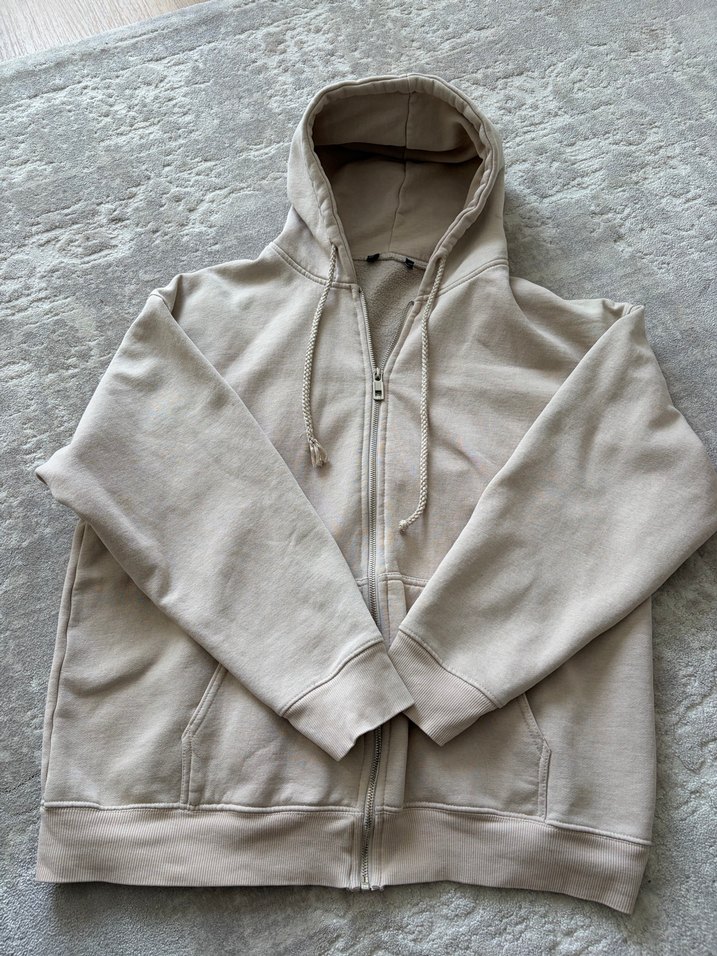 Bej renkte, yumuşak keten kumaştan yapılmış kapüşonlu fermuarlı sweatshirt. Bol kesim, uzun kollu ve midi boyda, günlük kullanıma uygun. Aynı ceketin Kahverengi ve siyahı da var