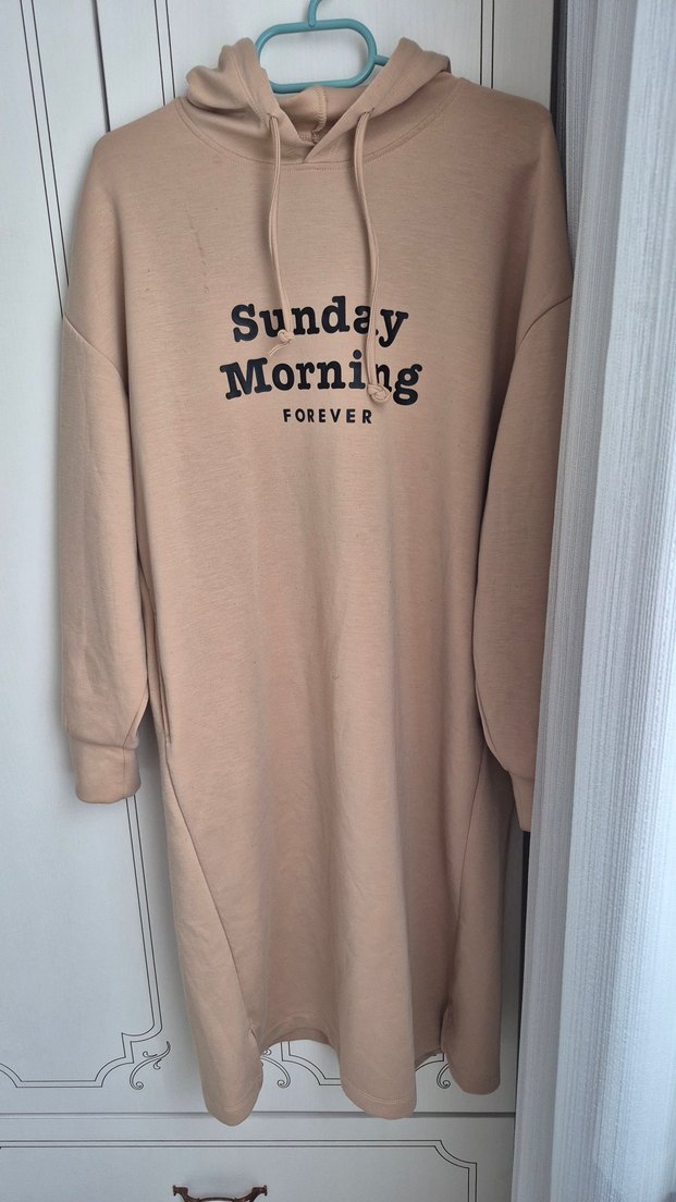 Bej renkli, yuvarlak yakalı ve uzun kollu, bol kesim kadın sweatshirt. Örme yumuşak kumaştan üretilmiş, üzerinde "Sunday Morning FOREVER" baskısı bulunur. Rahat ve günlük tarzda.