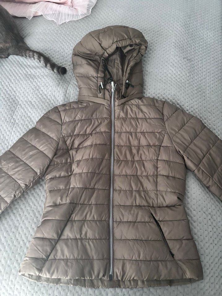 Bej kadın kış montu, kapüşonlu ve fermuarlı. Dar kesim, strappy kollu, yumuşak sentetik kumaştan günlük kullanıma uygun.