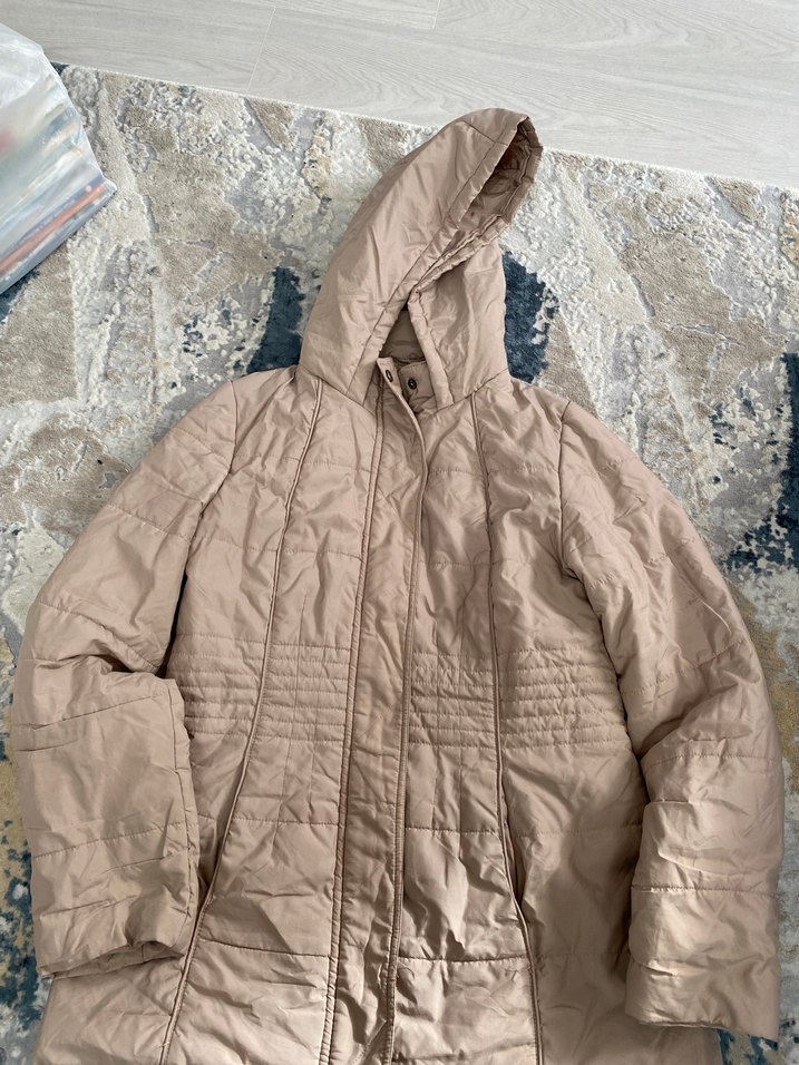 Bej renkli, kapüşonlu ve fermuarlı kadın kışlık mont. Uzun kollu, ince kesimli ve polyester kumaştan, günlük sokak stiline uygun.
