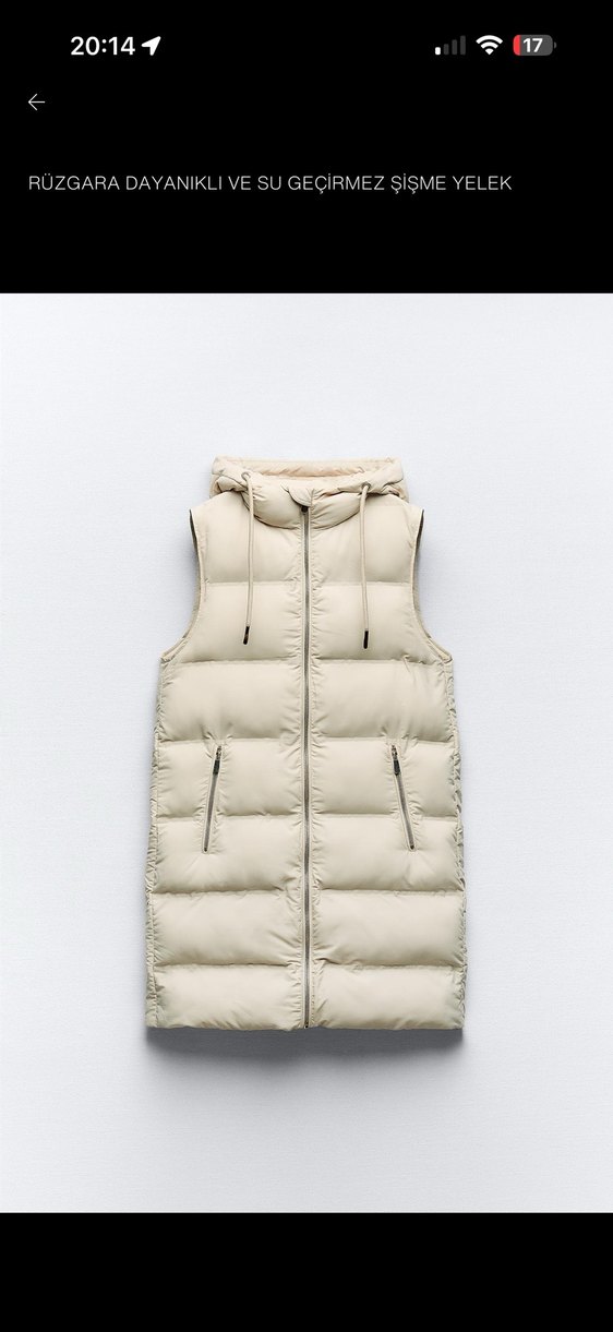 Bej renkte, kapüşonlu , yüksek yakalı, yumuşak kumaştan yapılmış, normal boy ve fitted kesim kadın şişme yelek. 1 kere giydim tertemiz