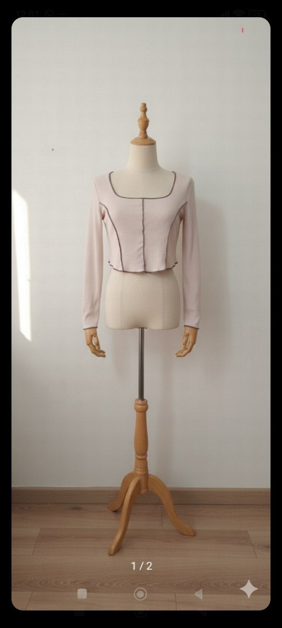 Uzun kollu, kare yaka ve kontrast dikiş detaylı bej triko bluz, günlük kullanıma uygun şık ve rahat bir tasarımdır.