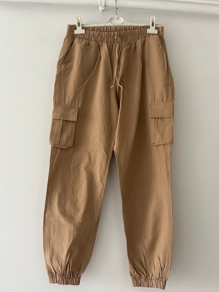 Beli lastikli Bej keten kumaştan, bol kesim ve midi boyda, lastikli bel ve yan cep detaylarına sahip rahat kadın pantolonu. Günlük kullanım için idealdir.