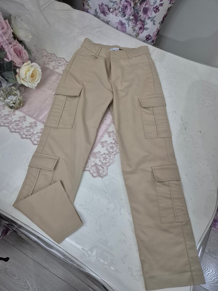 Bej renkli, normal boy midi kadın kargo pantolon. Pamuklu kumaştan, rahat kesim ve çoklu ceplerle günlük kullanıma uygun.