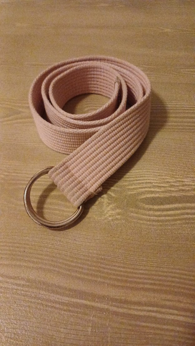 Bej renkte, kemerli, yumuşak sentetik kumaştan yapılmış ve metal halka tokalı minimalist kadın kemeri.