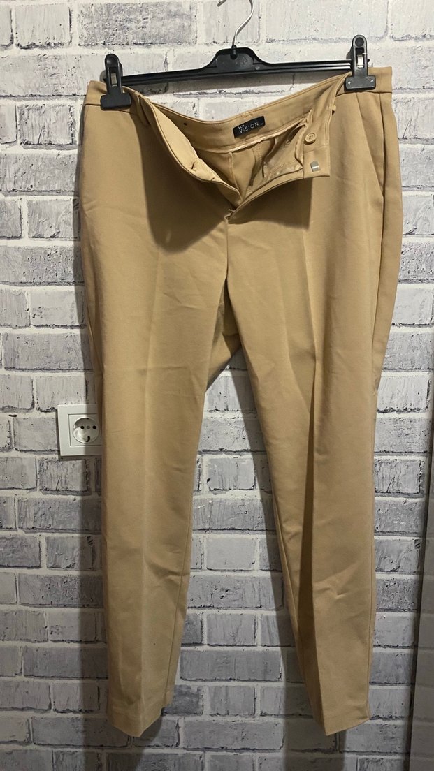 Bej renkli, kemerli kumaş kadın pantolon. Normal boy, regular fit ve parlak sentetik kumaştan, ofis ve günlük kullanıma uygun.
