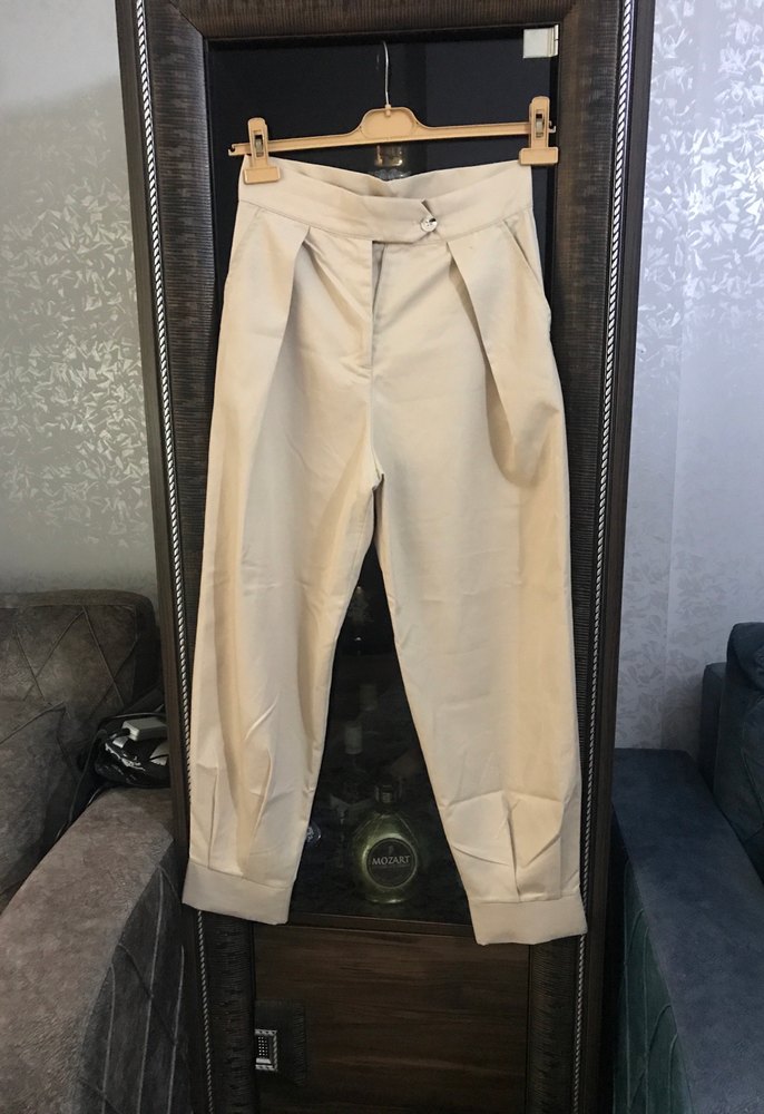 Bej renkli, pamuklu kumaştan yapılmış, kemerli ve normal boy midi pantolon. Ofis ve sokak tarzına uygun, rahat ve desen içermeyen model.