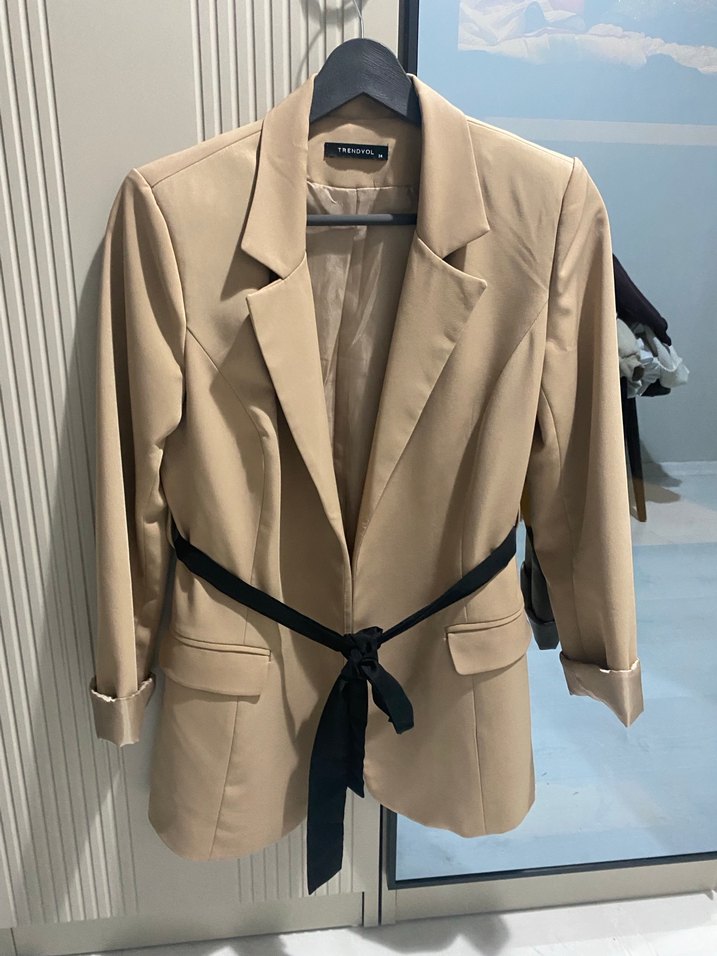 Bej renkli, yakalı, kemerli ve askılı kollu kadın blazer. İpek gibi dokusu, normal kesim ve midi boyda, ofis ve günlük kullanım için uygundur.