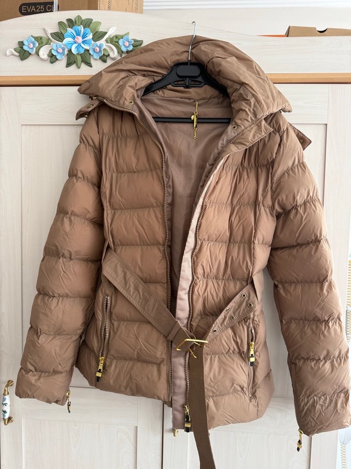 Bej renkli, kemerli ve midi boyda kadın kışlık mont. Strappy kollu, yumuşak sentetik kumaştan, notched lapel yakalı ve günlük sokak stiline uygun.
