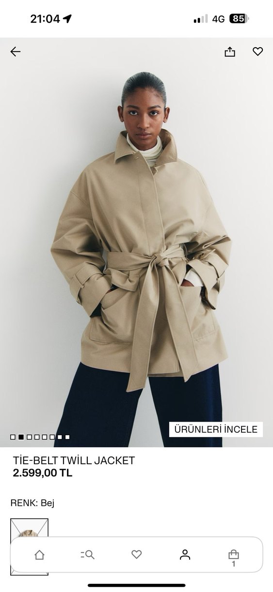 Bej renkte, kemerli, bol kesim, diz boyu uzunluğunda kadın trençkot. Notlu yaka ve uzun kolludur. Hafif sentetik kumaştan, gündelik kullanıma uygundur.