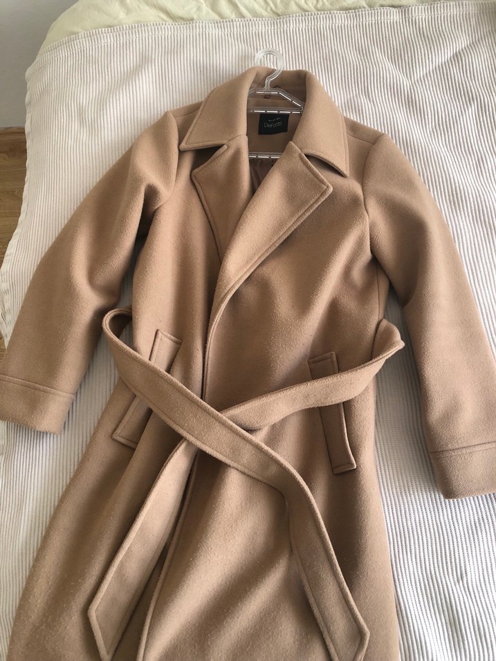 Bej renkli, yün kumaştan kemerli kadın kaban. Normal kesim ve midi boyda, günlük kullanıma uygun rahat ve şık bir modeldir. Yaka tipi kesik yakadır.