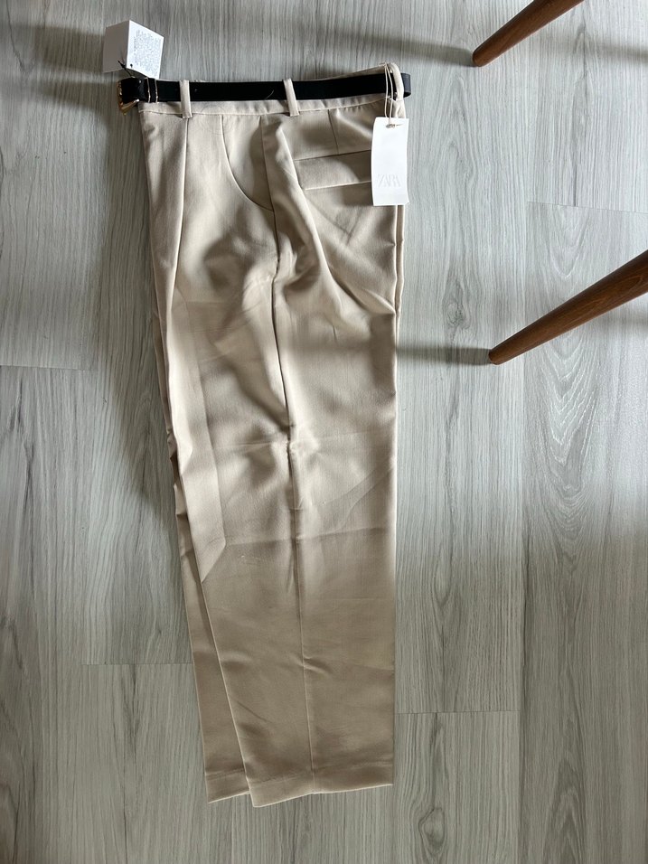 Bej renkte, kemerli ve normal kesimde, midi boyda kadın kumaş pantolon. Ofis stili için uygun, yumuşak ve parlak kumaştan üretilmiştir.