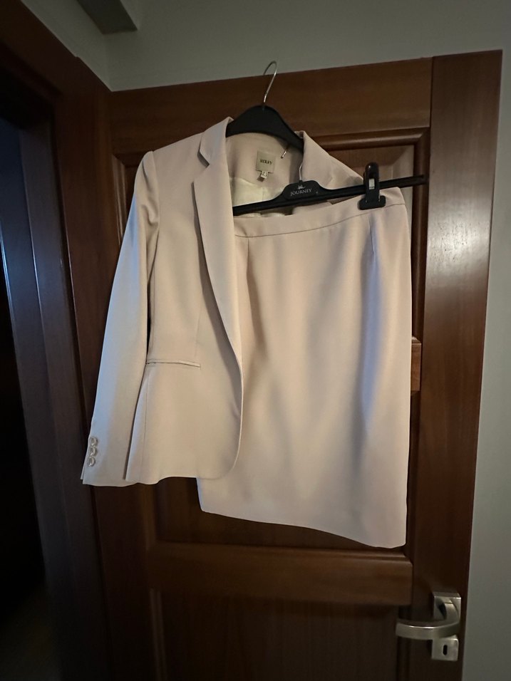 Bej Kadın Kemerli Ofis Blazeri takım etek ceket
