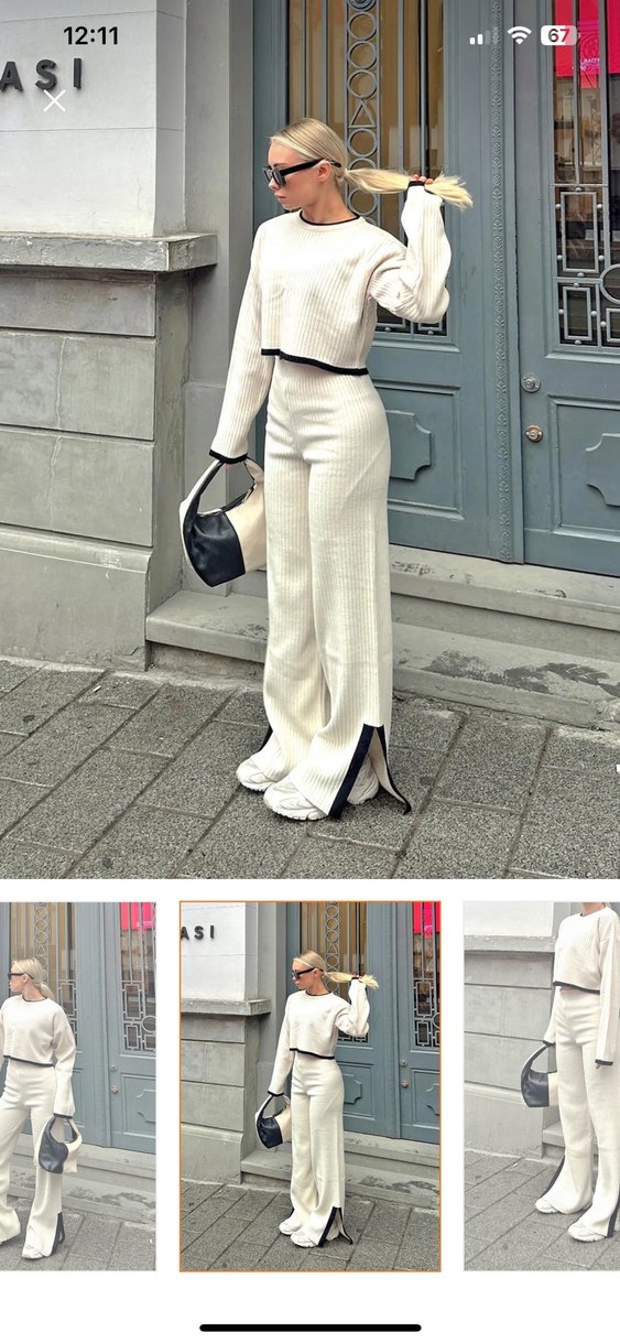 Beyaz, kemerli, rahat kesim ve uzun paçalı kadın takım. Parlak ve desen içermeyen yumuşak sentetik kumaştan üretilmiştir.