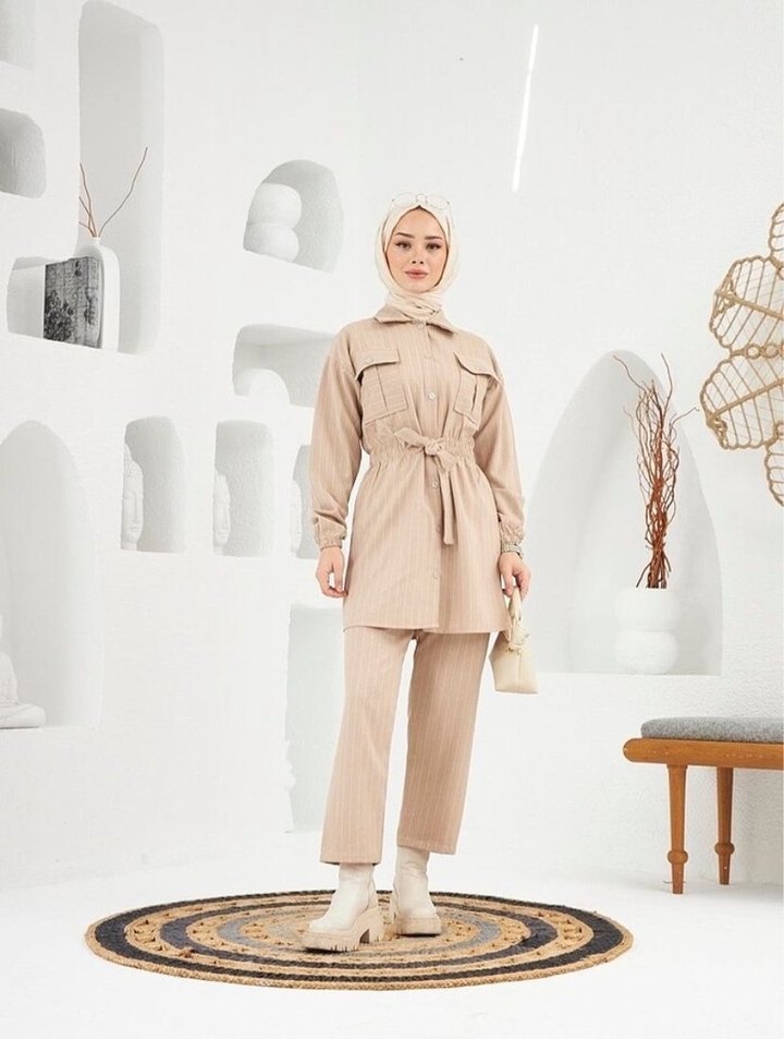 Bej Kadın Kemerli Uzun Takım