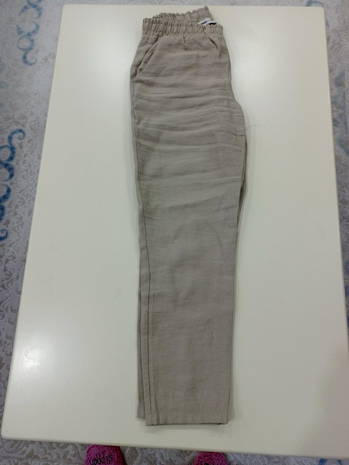 Bej keten kumaştan, pilili ve normal kesim uzun pantolon, minimalist ve normcore tarzıyla günlük kullanıma uygundur.