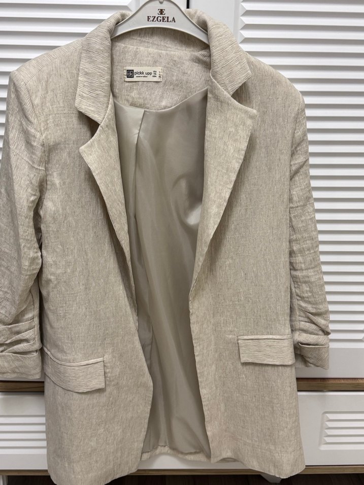 Bej renkli keten kumaştan, uzun kollu ve düğmeli, kesimli yakalı kadın blazer ceket. Ofis ve günlük kullanıma uygun.