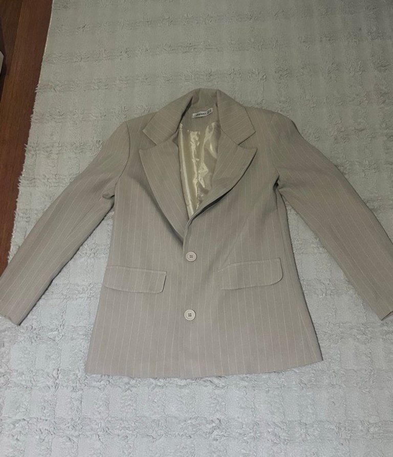 Bej keten kumaştan, yakalı ve düğmeli ön kısmı olan klasik kesim kadın blazer ceket. Uzun kollu ve normal boyda, ofis için uygun.