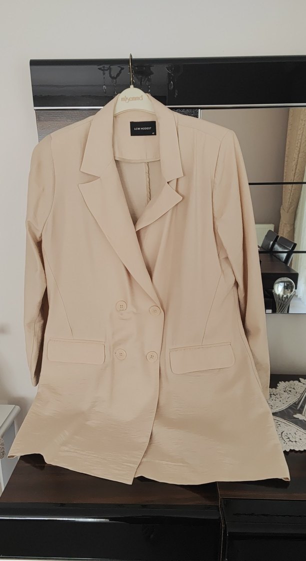 Bej renkli keten tarzı kadın blazer ceket, yaka detayı ve düğmeli ön kısmıyla. Uzun kollu, normal kesim, ofis için uygun. Parlak dokunuşuyla çağdaş stil sunar. Bir kere giyildi kusursuz bekliyor