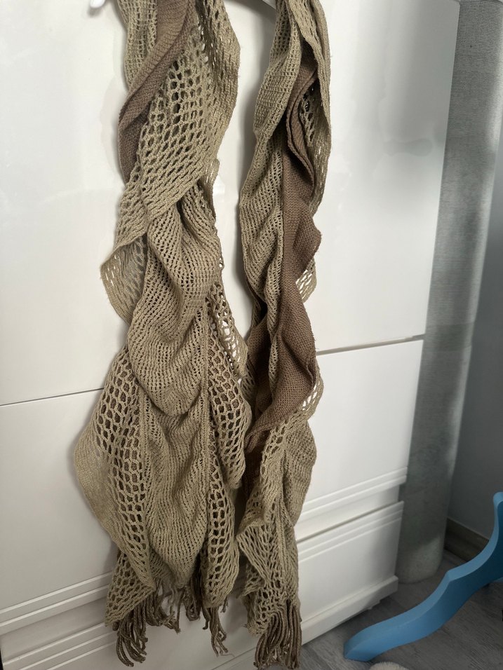 Bej keten kumaştan yapılmış, bohem tarzda, gri tonlarda rahat ve drapeli kadın atkısı. Yumuşak ve nefes alabilir dokusu ile şık ve öncü bir görünüm sunar.