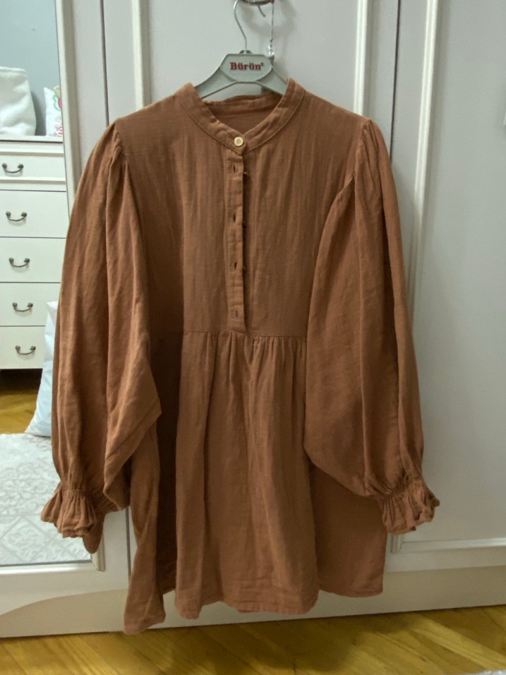 Bej keten kumaştan, bol kesim ve midi boyda tunik. Uzun kollu, yüksek yakalı ve düğmeli ön detaylı, vintage bohem tarzında. Günlük kullanıma uygun.