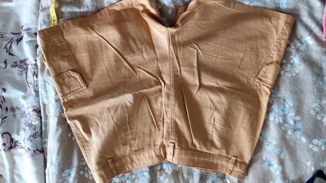 Bej keten kumaştan, düğmeli ve bol kesim kadın şortu. Şık ve spor diz üstü boyda, sade ve günlük kullanıma uygun.