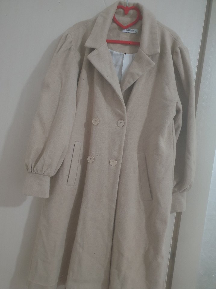 Bej renkli, keten kumaştan midi uzunlukta, düğmeli ve kruvaze yakalı kadın ceketi. Salaş kesim ve uzun kolludur, günlük kullanıma uygundur.