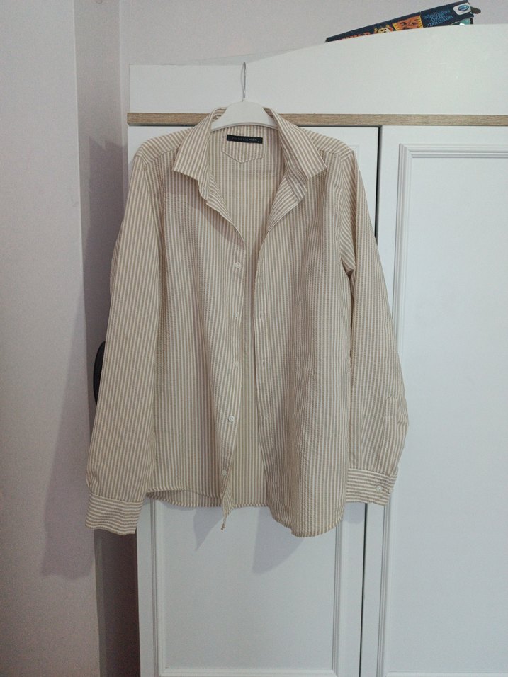 Bej renkte, keten kumaştan yapılmış, uzun kollu ve yakalı kadın gömleği. Düğmeli ve ince çizgili deseniyle ofis kullanımı için uygundur.