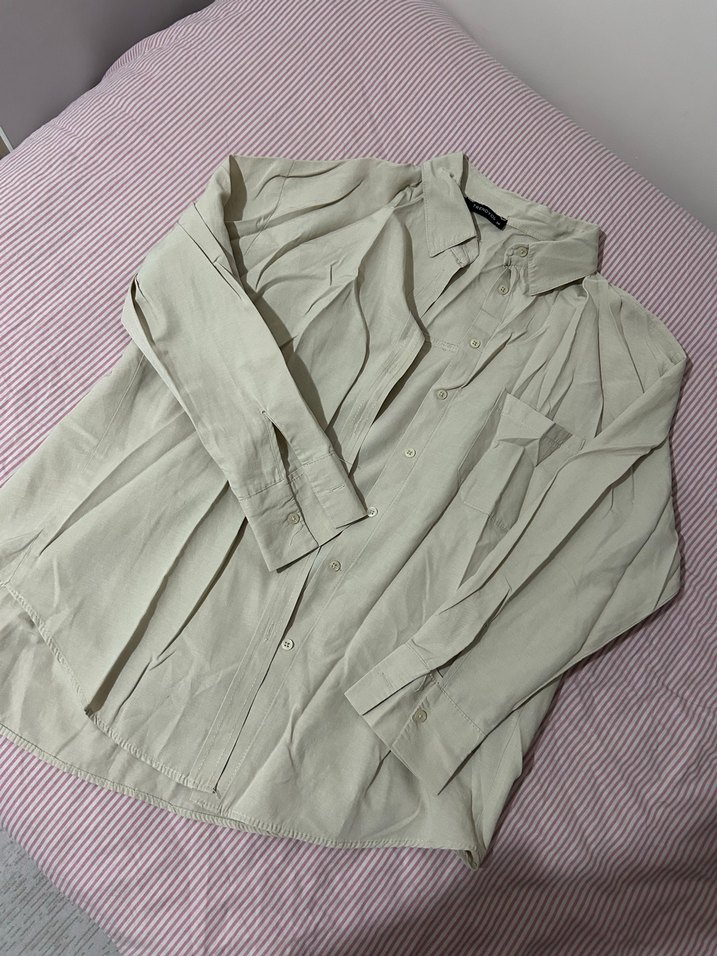 Bej keten gömlek, uzun kollu, yakalı ve düğmeli ön detaylıdır. Bol kesim ve normal boydadır, günlük kullanım için uygundur. Bir kez kullanıldı