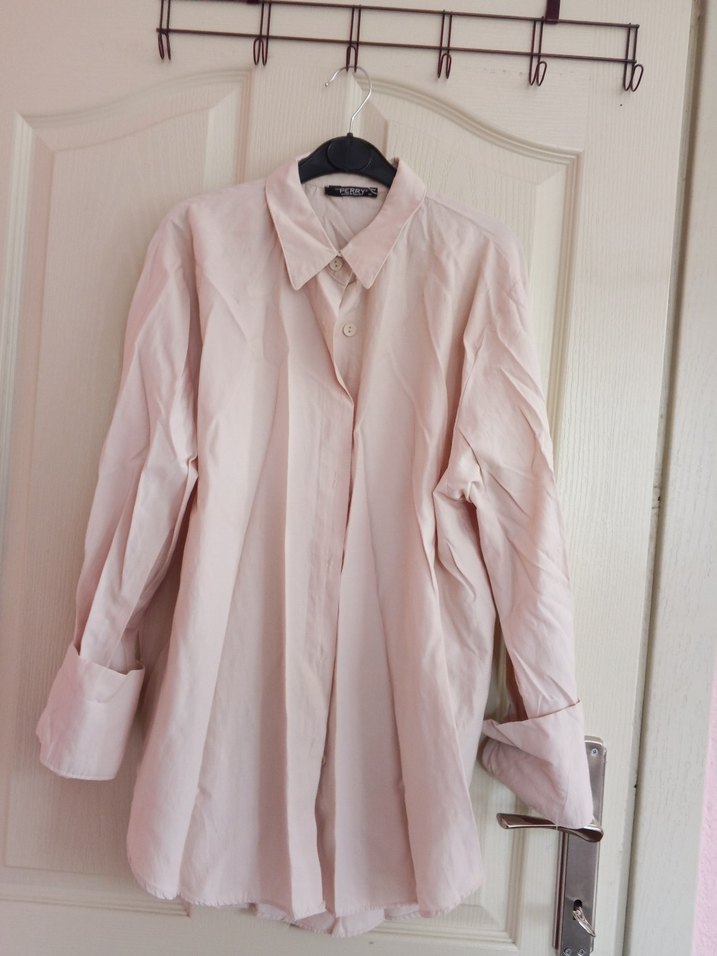 Bej renkli, keten kumaştan, bol kesim kadın gömlek. Yaka ve uzun kollu, düğmeli, ofis kullanımı için uygun normal boyda, pastel tonlarda sade model.