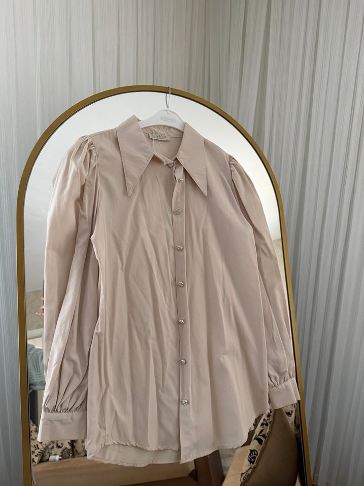 Bej keten gömlek, düğmeli ve bol kesimlidir. Yakalı ve uzun kollu tasarımı ile ofis için uygun, trend ve rahat bir tarza sahiptir.