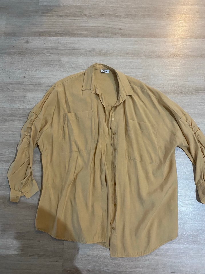 Bej renkli, keten kumaştan, düğmeli, uzun kollu ve yakalı, rahat kesim kadın gömleği. Günlük sokak stili için uygundur. Kollarında Büzgülü detayı var