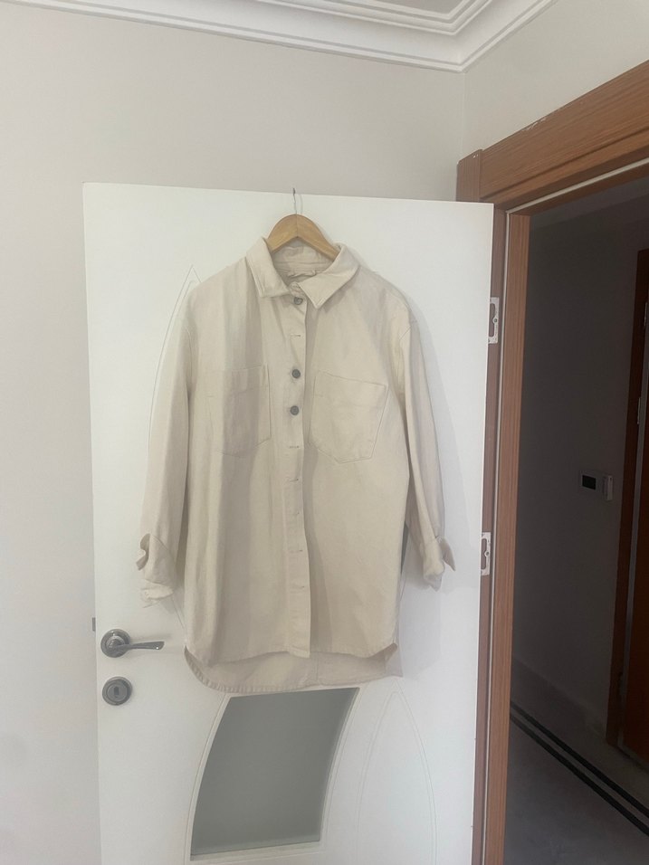 Bej keten gömlek, uzun kollu ve düğmeli. Yaka detaylı, bol kesim ve midi boyda, minimalist normcore tarzda günlük kullanıma uygun.
