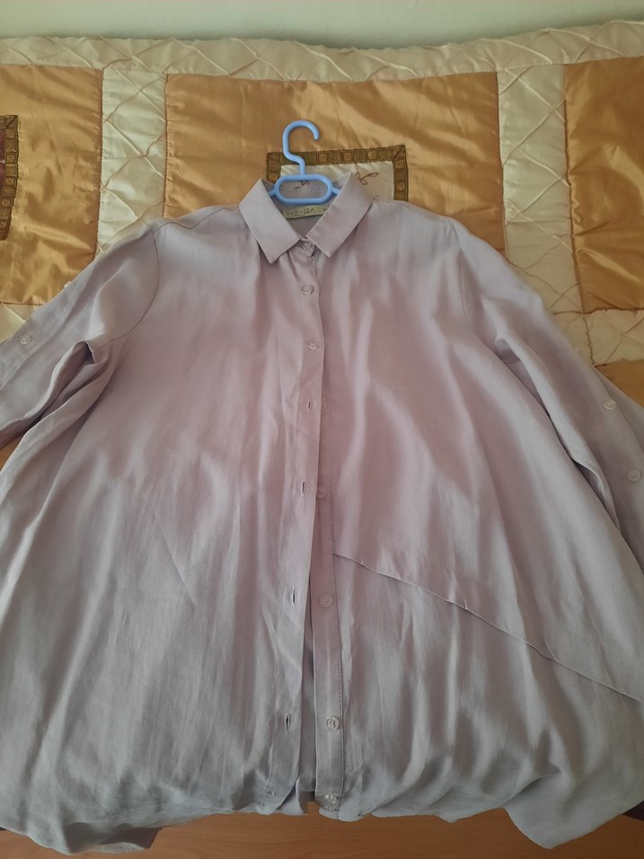 Bej renkli keten kadın gömlek, düğmeli ve uzun kolludur. Salaş kesimi ve normal midi boyuyla ofis için uygundur. Desensiz, gündelik normcore tarzındadır.