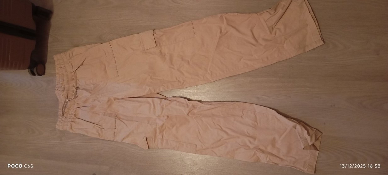 Bej keten kumaştan, rahat kesim ve midi boyda kadın pantolon. Minimalist ve normcore tarzıyla dış mekan kullanımı için uygun, zahmetsiz şıklık sunar. minik bı lekesı var o yüzden uygun.