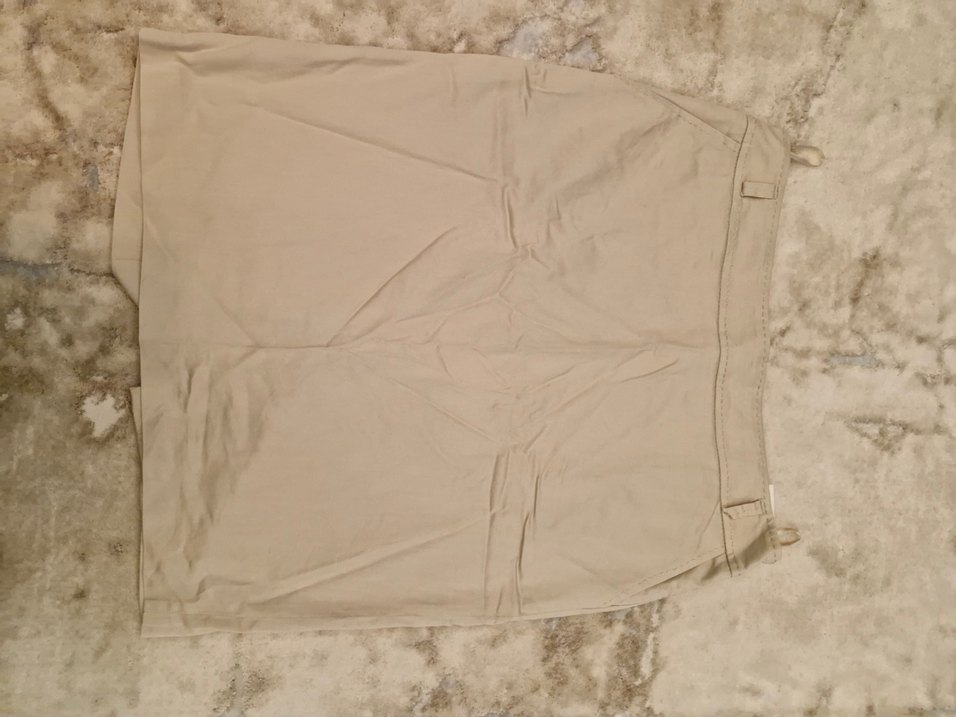 Bej renkli, kumaştan yapılmış, normal boy midi kesim ve rahat tarzda kadın etek
