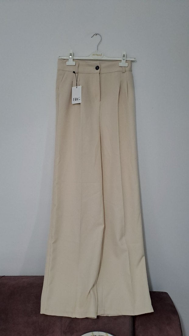 Bej renkte, uzun paça, keten kumaştan yapılmış kadın pantolonu. Düzenli kesim ve sade, deseniz sade ofis stiline uygun.