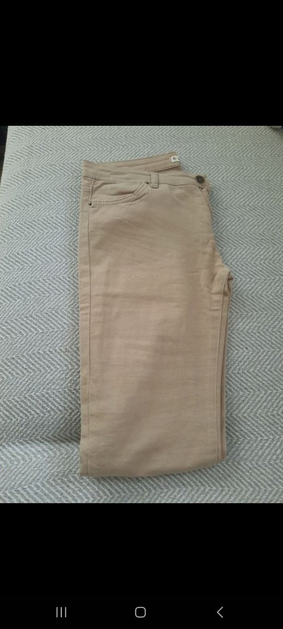 Bej keten kumaştan, normal boy midi uzunlukta, rahat kesim pantolon. Günlük kullanıma uygun, zahmetsiz şıklık sunar.