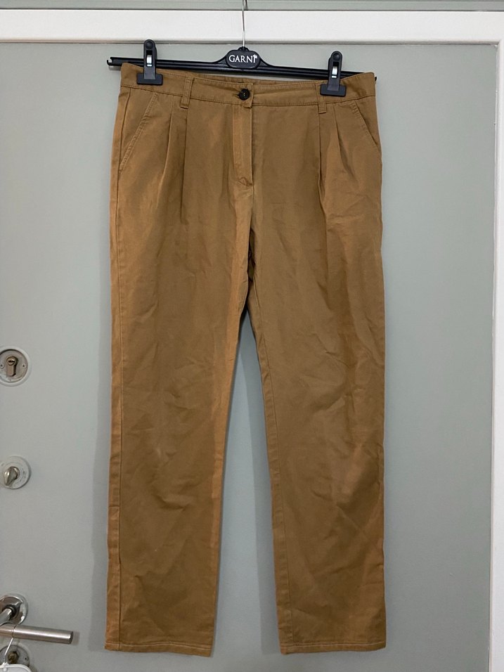 Bej keten kumaştan, regular fit ve midi boyda, desen içermeyen kadın pantolon. Günlük kullanıma uygun, parlak ve rahat bir şıklık sunar. ✨